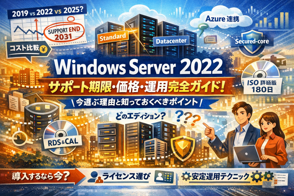 本記事では、Windows Server 2019やWindows Server 2025との違いとサポート期限、StandardとDatacenterの費用対効果、RDSやCALを含めたライセンス構成、ISOや評価版の安全な使い方、更新プログラムやKB障害を避ける運用ルールまで、Windows Server 2022を中心に一気通貫で整理します。「どのバージョンをいつまで」「どのEditionをどの価格帯で」「どの構成なら将来詰まないか」がこの記事だけで判断できるよう設計しています。サーバー選定やライセンス購入を感覚で進める前に、数分だけ投資して読み進めてください。