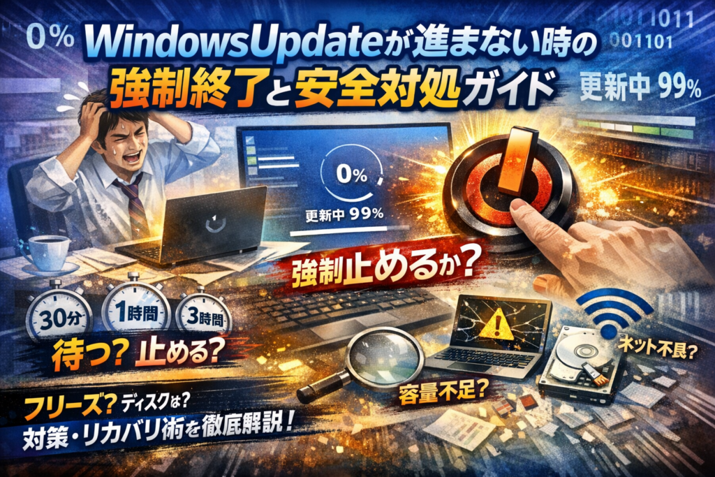 Windows Updateが進まないせいで、PCも業務も止まり続けていませんか。ダウンロード中0%やインストール中20%・83%・99%、「更新プログラムを構成しています0%」「更新が進行中です 終わらない」ままの画面を前に、強制終了してよいのか判断できない時間こそ、最大の損失です。多くの解説は原因や対処法を並べるだけで、どこまで待ち、どのタイミングで止めるべきかを時間とディスク挙動で線引きしていません。