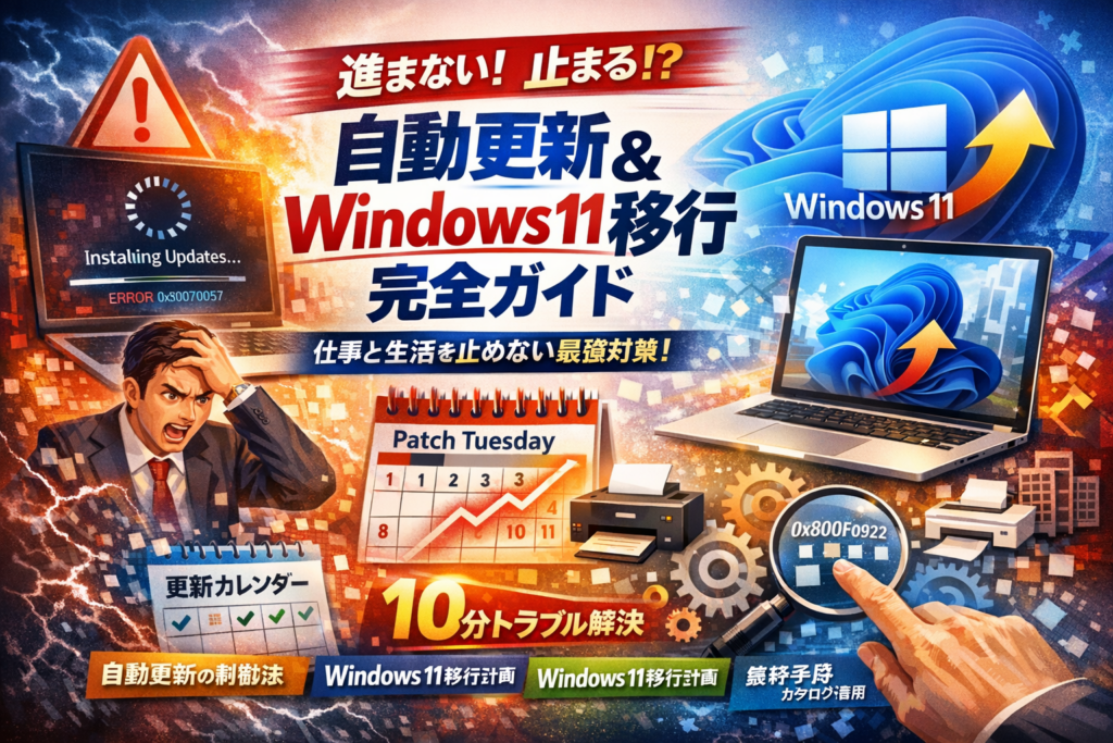 本記事は、単なる操作マニュアルではありません。月例パッチや大型アップデートのスケジュールを読み解き、いつ更新し、いつ様子見するかを決める「運用カレンダー」と、進まない・終わらない・エラーコードだらけの状態から10分で原因レイヤーを切り分ける現場式トラブルシューティングをまとめています。さらに、プリンタや業務アプリを止めないための段階的展開、自動更新をどこまで無効化してよいかの安全ライン、windows updateカタログを最後の一手として使う判断基準、そしてWindows10から11への移行計画までを一気通貫で整理しました。