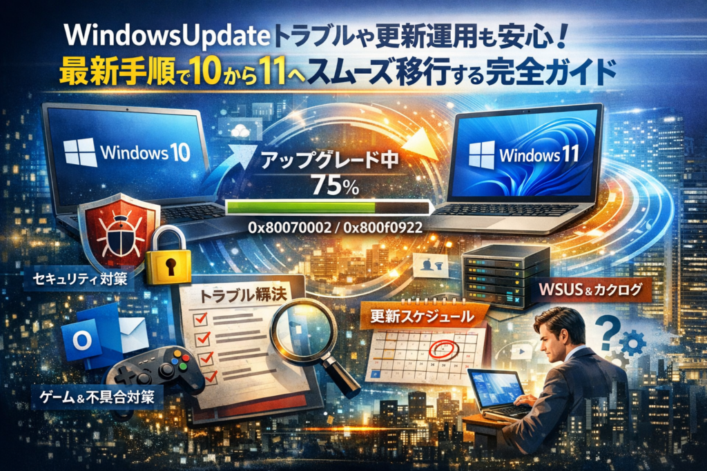 本記事では、Windows10とWindows11の更新プログラムを、家庭用PCから小規模ビジネスまで安全に運用するための実務ロジックだけを整理しました。Windows Updateが0%から進まない、0x80070002や0x800f0922が出る、ゲームやOutlookが不安定になる、といった典型的なトラブルをどこまで自力で直し、どこからWindows UpdateカタログやWSUSを使うのか。さらに、Windows10サポート終了を見据えたWindows11へのアップグレード戦略と、月例更新のスケジュール設計まで一気通貫で押さえます。これを知らずにその場しのぎで再起動や停止を繰り返すことこそ、最も高くつく「見えない損失」です。