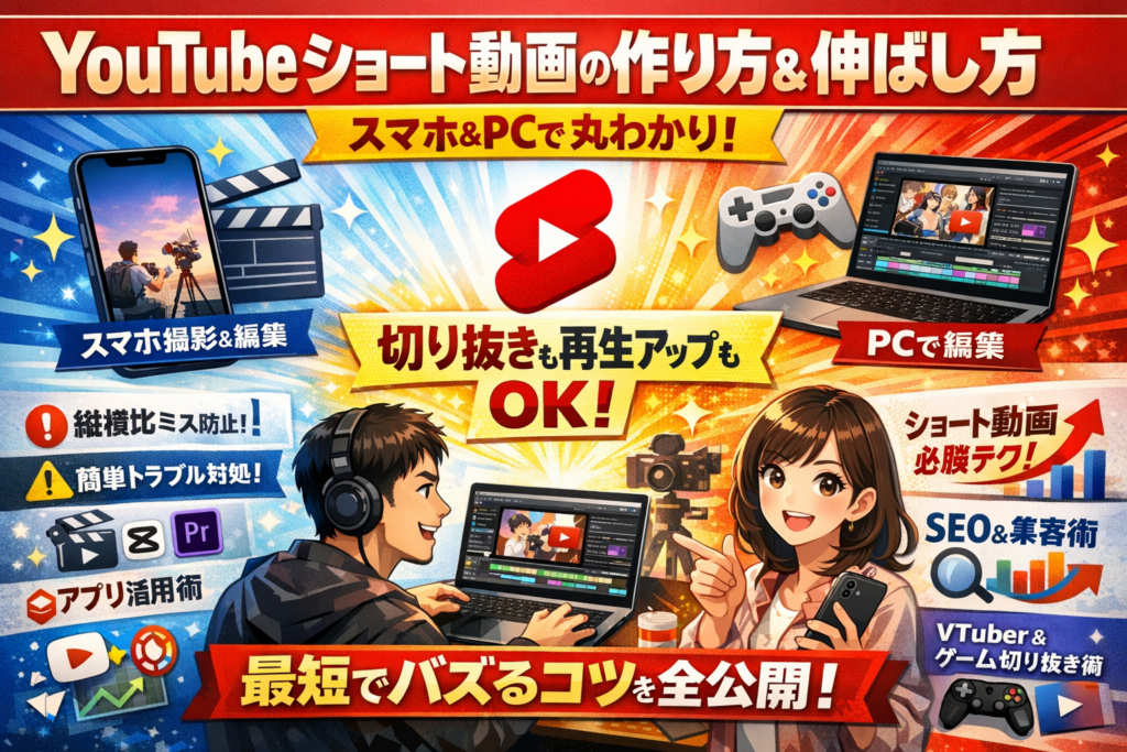 ショート動画の定義や長さ、サイズ、アスペクト比、YouTubeアプリやCapCutなどの編集アプリ、PCやPremiere Pro・AviUtl・Canvaでの作り方、公式機能を使った既存YouTube動画からの切り抜き方法、ショート動画扱いにならない原因と対処、再生数アップのコツといった一般的な情報は、ここで一気に整理します。