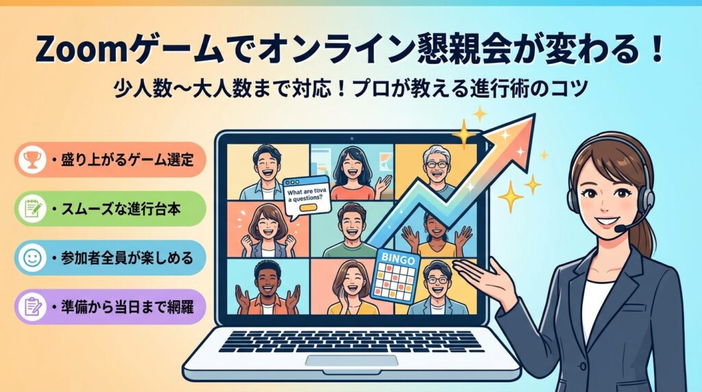 この記事では、zoomしりとりやマジカルバナナ、ワードウルフ、人狼、オンラインビンゴといった定番から、Zoomラウンジや一致するまで終われまテンなどのブラウザゲームまでを、少人数から大人数イベントまで破綻させない実務ロジックで整理します。さらに、zoomゲームバー録画で本当に何がバレるのか、スマホ参加でも問題なく回るやり方、60分・90分のタイムテーブルと進行テンプレ、事後アンケートで次回の満足度を底上げする振り返り法まで、一連のフローを通して設計します。