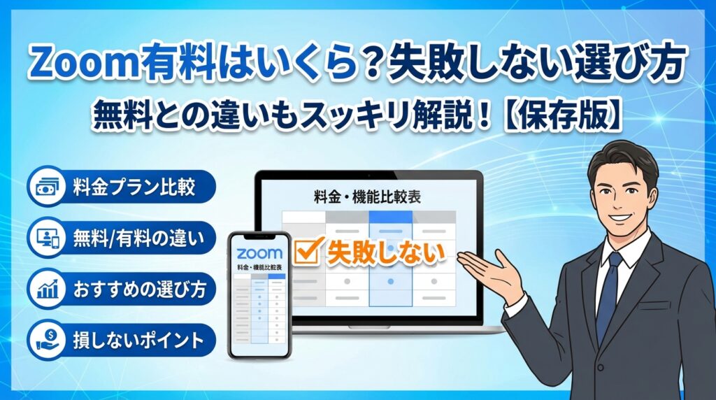 本記事では、個人や中小企業が気にする「zoom 有料 プラン いくら」「zoom 有料 アカウント いくら」「年間でいくらお得か」といった価格の目安を最初に整理したうえで、40分制限、クラウド録画、AI要約、参加人数、ホストとライセンス設計がビジネスの数字にどう効いてくるかを利用シーン別に線引きします。