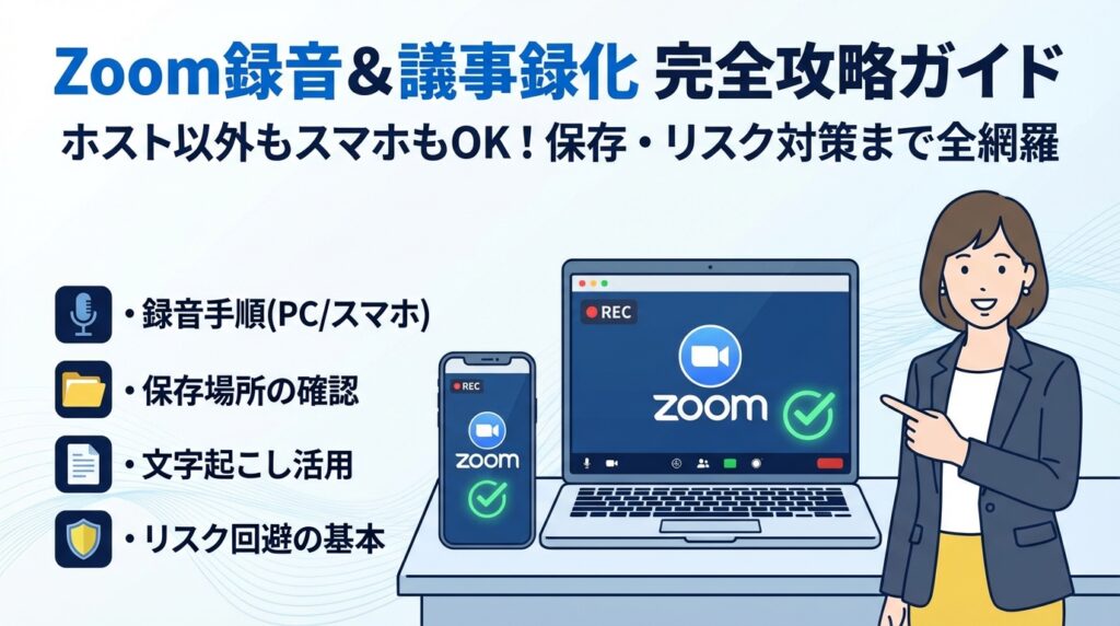 この記事を読み終える頃には、「zoom録音データどこ?」と探し回る時間も、「スマホで音声が入らない」原因探しも、「この会議を録音して大丈夫か」という不安も、まとめて処理できる状態になっているはずです。